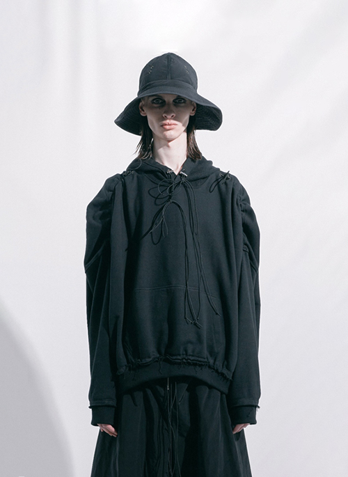 Details: pleats shoulder hoodie oversized fit additional hood backside don't shock to wear drawstring at hood kangaroo pocket supplier color: black 100% cotton made in South Korea model is 185 cm and wears a size M
