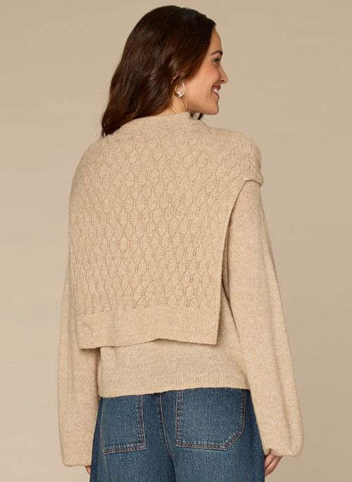 With long sleeves, a round neck, and a straight hem, this pointelle sweater is a must-have style. It leans into the twofer trend with a sweater tie front that creates a layered look.