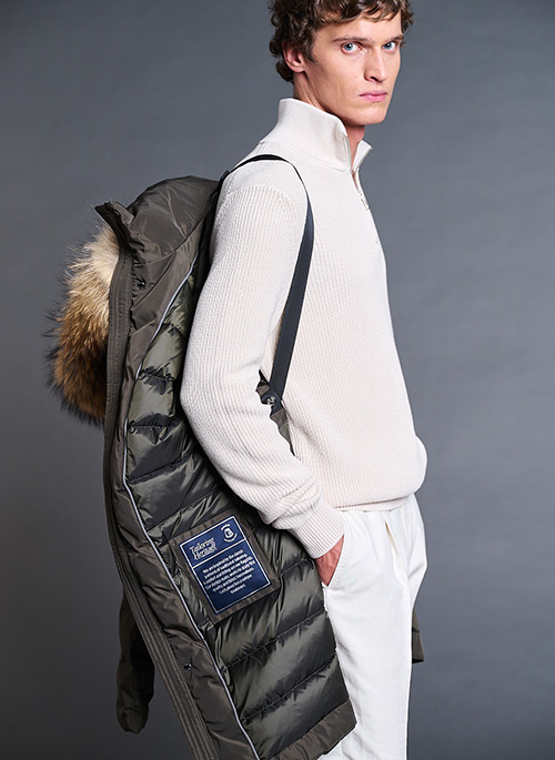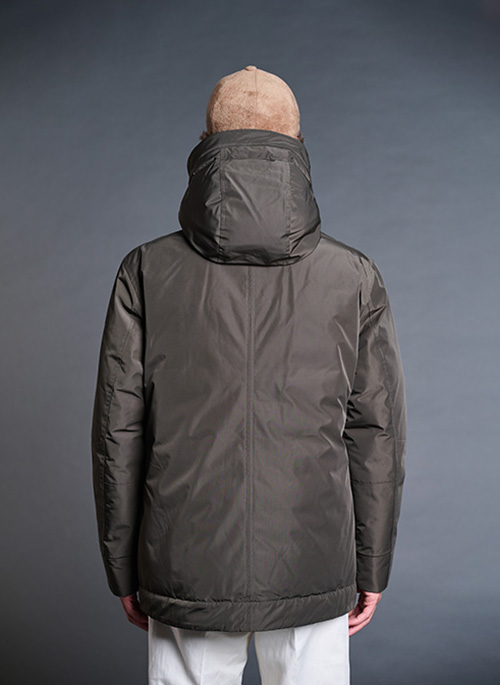 Men's short parka. Center closure with a custom double-zipper and snaps. Interior zipper pocket with contrasting piping. Fixed hood with visor and drawstrings. Pockets with custom zippers. Water-repellent and windproof fabric. Thermoregulating down filling.Details: