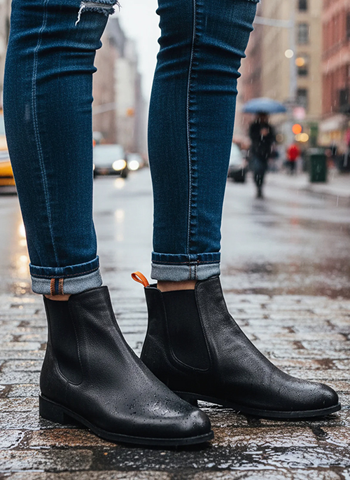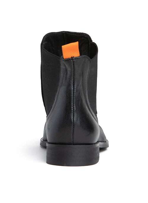 Classic black leather ankle bootie with a smooth leather upper. The low heel boots feature a slip-on design with side goring elastics, with an orange accent on the top.Details: