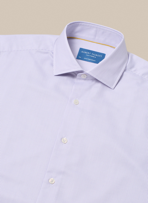 An everyday essential with elevated detail. The Reynolds Contemporary Stripe Twill Shirt is made from Italian fabric in a fine twill weave, with a classic light blue stripe that never goes out of style. Designed with an edge-stitched Monterey collar, French placket, and single-needle tailoring for a clean, structured finish.