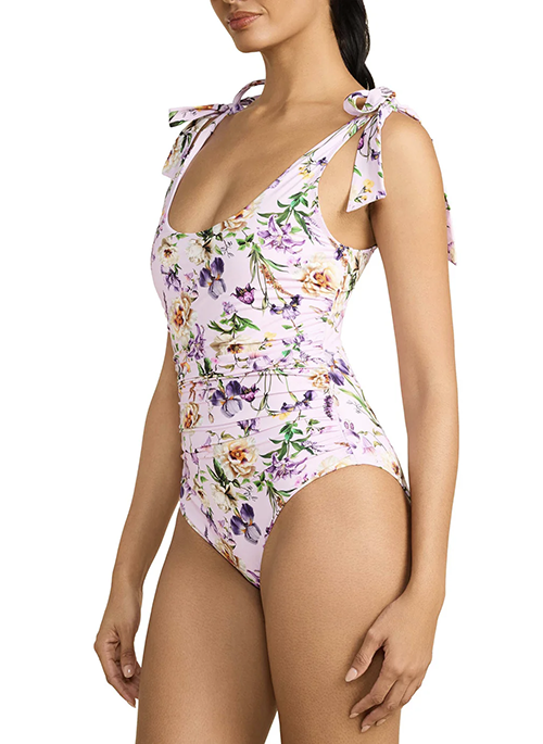 - Adjustable bows at wide shoulder straps and ruching all throughout swim bodice front