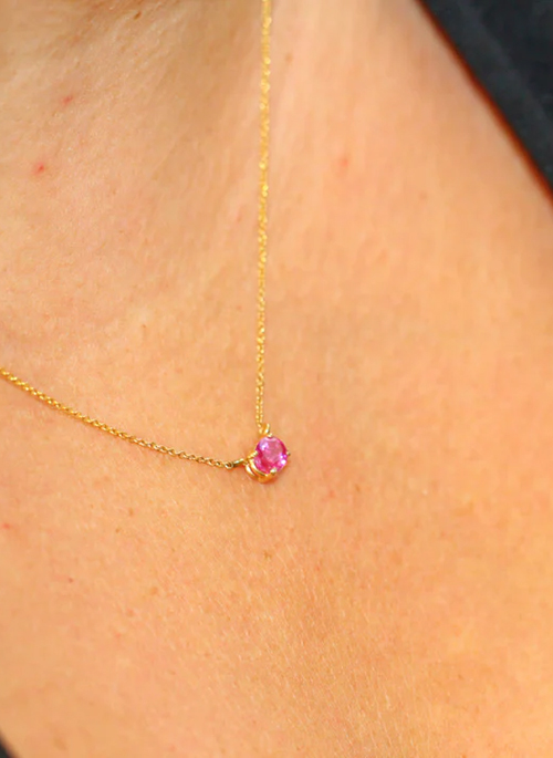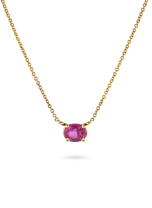 A delicate 14K yellow gold necklace featuring a captivating oval pink sapphire at its center. The gemstone is gracefully suspended on a 16-inch rolo link chain, offering a refined balance of elegance and everyday wearability.