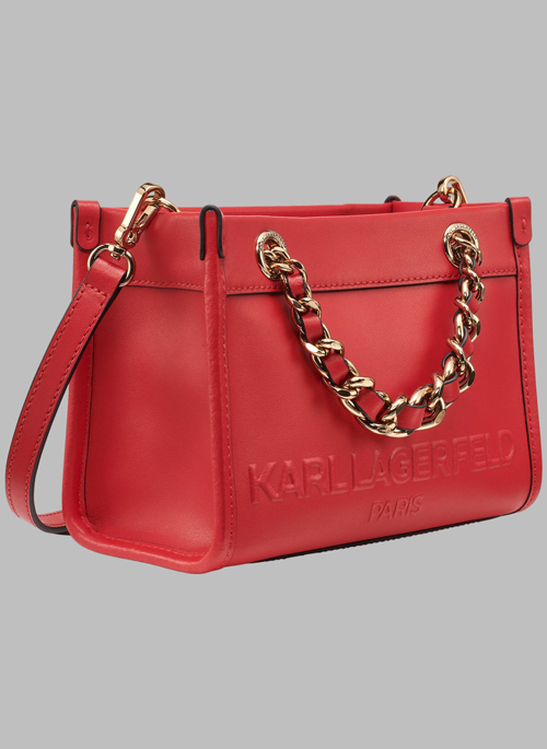 - Double chain handles; adjustable, removable shoulder strap; magnetic snap fastening; exterior back slip pocket