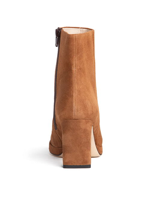 Elegant cognac suede bootie with a block heel and small platform. A side zipper makes entrance easy. Sleek light brown suede and comfortable thanks to a padded insole. Almond toe style.Details:
