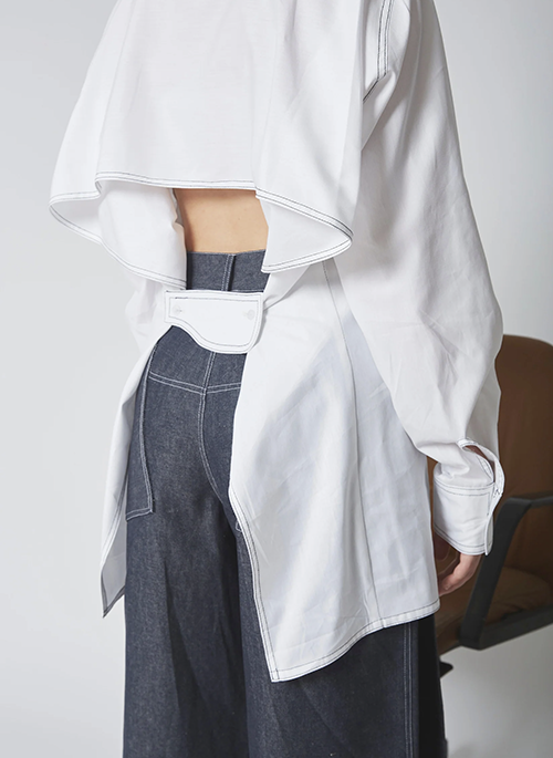 - Adjustable strap at the back, fastened by two buttons on each side for a fitted effect.