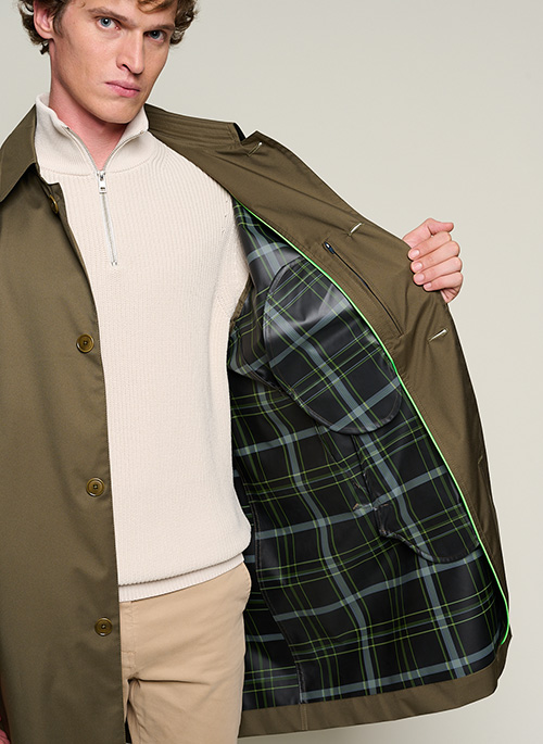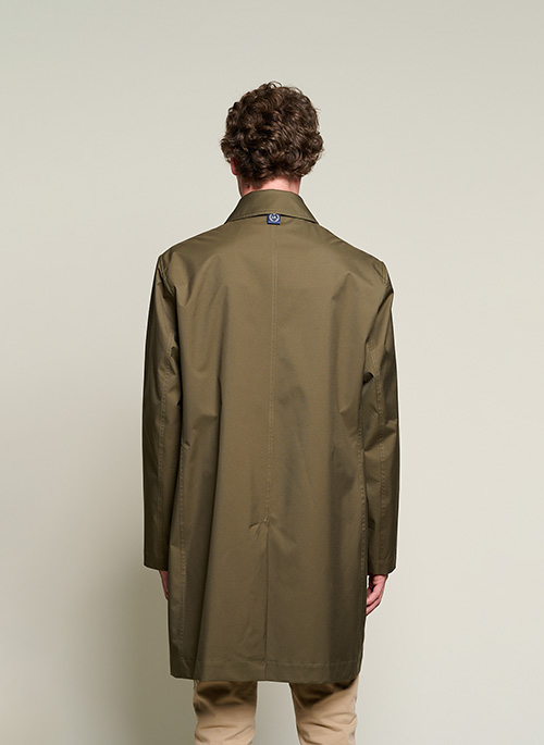Men's long parka with a simple cut. Center button closure. Welt pockets. Inside zippered pocket with name trim. Contrast collar.Details: Buttons