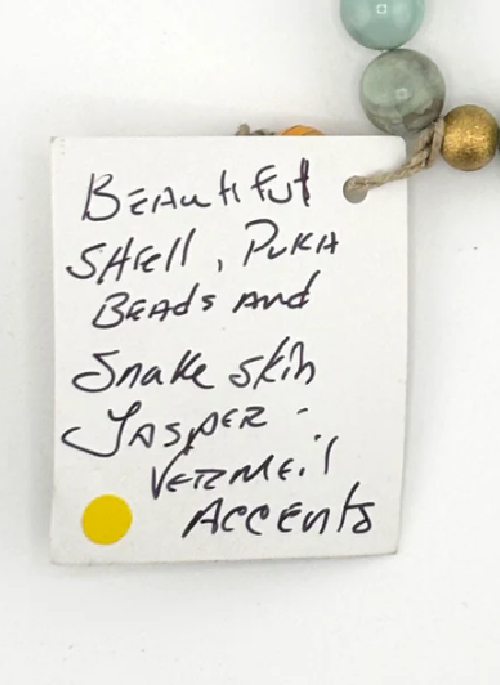 GORGEOUS SHELL WITH PUKA BEADS AND SNAKE SKIN JASPER WITH VERMEIL ACCENTS.