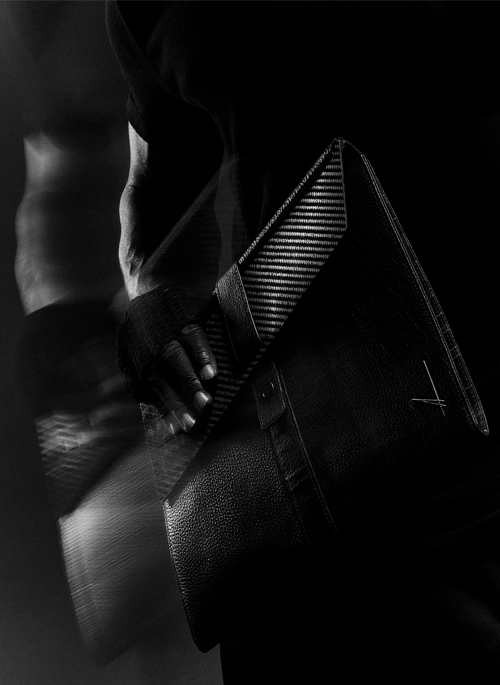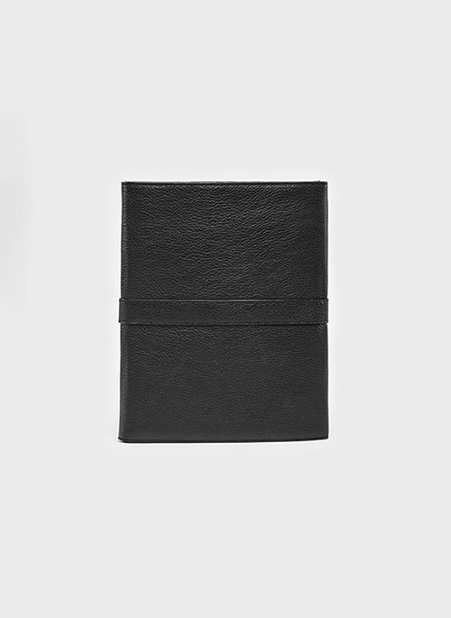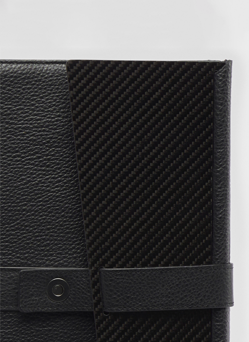 The Skew notepad holder, crafted from ultra-soft hammered grain leather and carbon fiber, exudes a luxurious feel every time you open it.