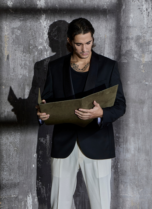The accessory is embellished with the Alberto Olivero monogram logo in brass on the front, and the magnetic flap seamlessly integrates into the design.