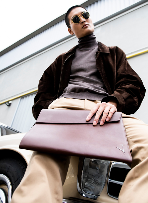 The accessory is embellished with the Alberto Olivero monogram logo in brass on the front, and the magnetic flap seamlessly integrates into the design.