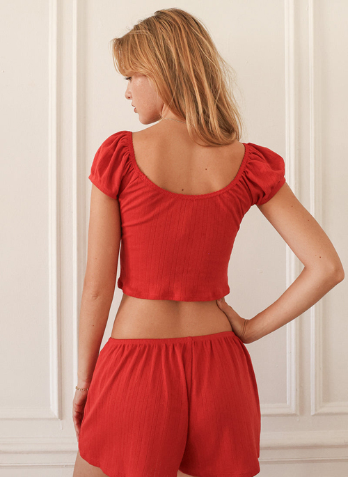 Our new lounge top features cozy capped sleeves, a mini bow detail at the front and center and a flattering scoop neckline with lace trim. Details:100% CottonMade in VietnamWide open necklineCap sleevesFront bust linedRibbed fabric