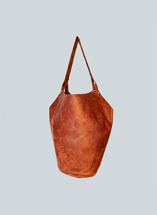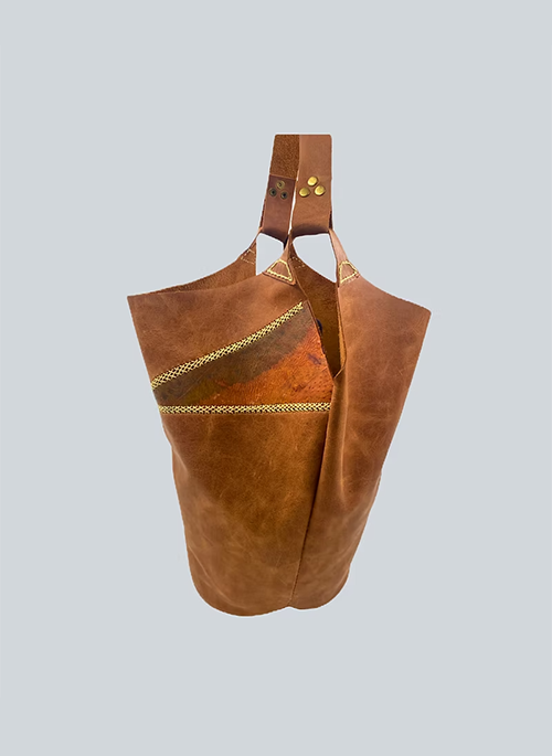 Solstice channels the golden energy of sunset into a wearable work of art. Handcrafted from our regenerative “organic sunset” pufferfish leather and premium copper-toned cow leather, this compact bucket silhouette blends function with fire.Details: