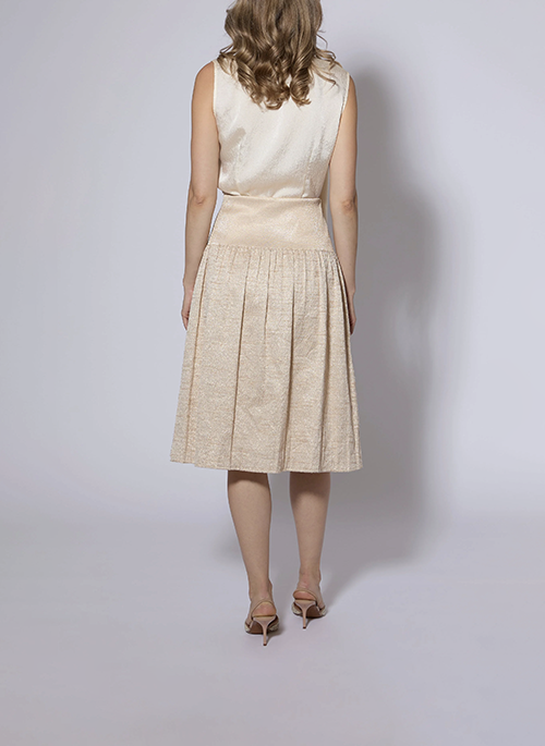 Details: Golden metallic fabric with subtle texture Elastic at waist for easy fitFlirty and fun for day or evening28 inches at center backFabric imported from France73 Polyester 16 Cotton 7 Metallized Fiber 4 Other Dry Clean Only
