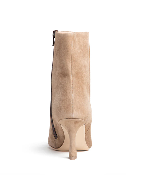 Modern ankle suede bootie with an inside zipper. This comfortable stylish pair features an edgy pointed toe and a medium height kitten heel, as well as a cushioned insole.