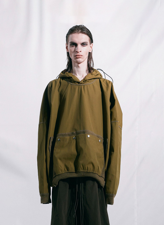 Details: SQUARE CUTTING HOODIE OVERSIZED FIT FULLY INSIDE OUT ALL SEEMS OUT DRAWSTING AT MIDDLE OF HOOD KANGAROO POCKET WITH BUTTON DOWN UNISEX SUPPLIER COLOR: KHAKI 100% POLY MADE IN SOUTH KOREA FW-23-HD-06 MODEL IS 185cm AND WEARS SIZE M