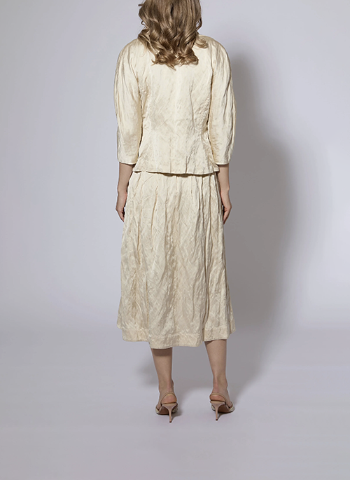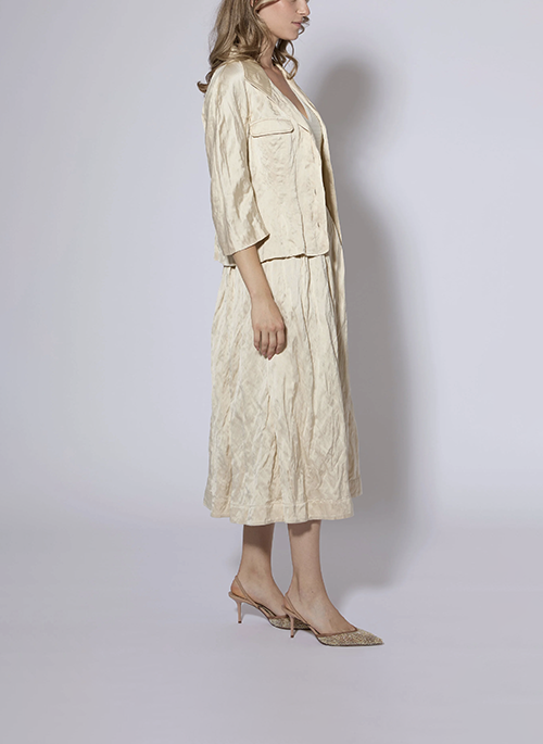 Details: Pleated texture fabric with metalHidden pocket at side under pleatFully lined in luxurious fabrication32 inches at center backFabric imported from Italy 92 Viscose 8 Steel MetalDry Clean Only