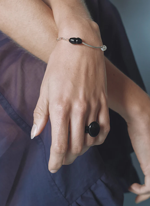 Still Bracelet balances curved silver lines, chain links, and hand-formed glass beads in a calm, asymmetric composition. Its gentle flow and soft contrast evoke the quiet rhythm of breath and pause.Details: