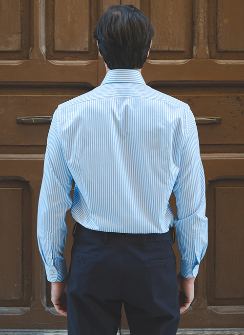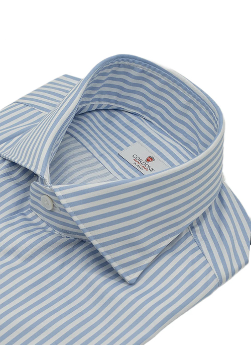 Striped Twill Shirt Azure is a shirt in double twisted Twill 120/2 , handcrafted in Italy, with the tailored pattern of the shifted sleeve and enriched with mother-of-pearl button and handmade buttonhole trim.Details: