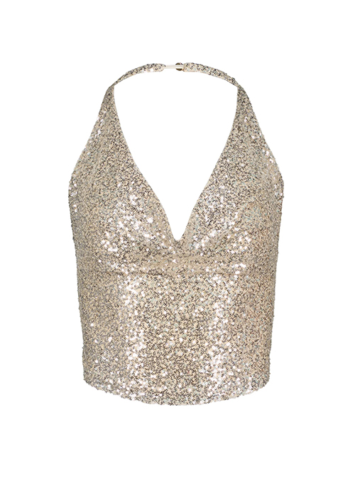 Meet the Sublime Halter Top, crafted from luxe sequin knit, this top features a delicate halter cowl neckline with fluid drape. It’s finished with back ties. Style it with our elegant Velvet Pant for evening elegance—or tuck it into jeans for a cool night-out look.Details: