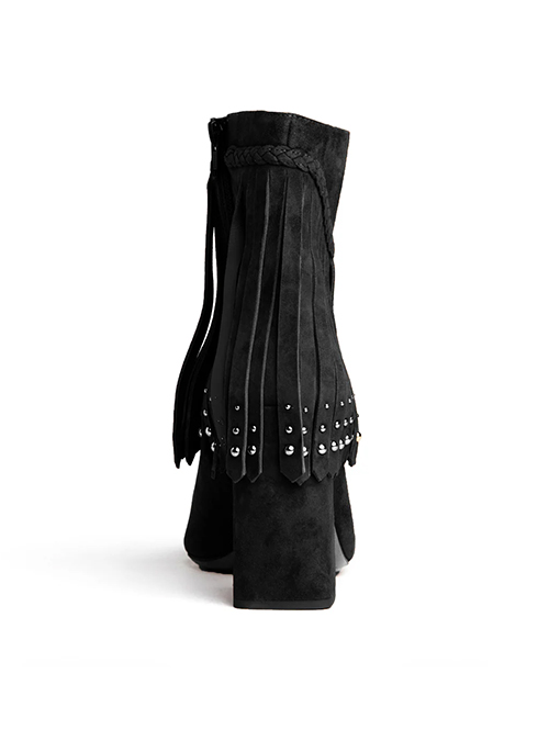 Elegant ankle black suede bootie with a side zipper hidden under the fringes. The fringes and grommet details are a guaranteed eye-turner! Block heel with a western look. Cushioned insole for comfort.Details: