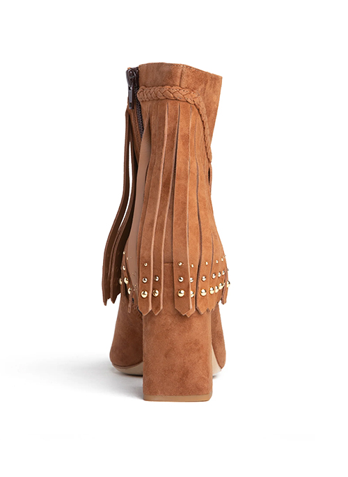 Ankle brown suede bootie with a side zipper. The fringes and grommet details are a guaranteed eye-turner! Block heel with a western look. Cushioned insole for comfort.Details: