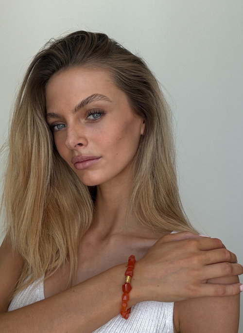The Tamarillo Bracelet is crafted from rugged vibrant carnelian quartz.