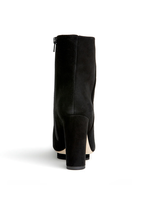 This ankle boot offers height with added comfort, but without the pitch, thanks to its hidden island platform and block heel. This bootie is crafted in black suede, cushioned insole and side zipper.Details:
