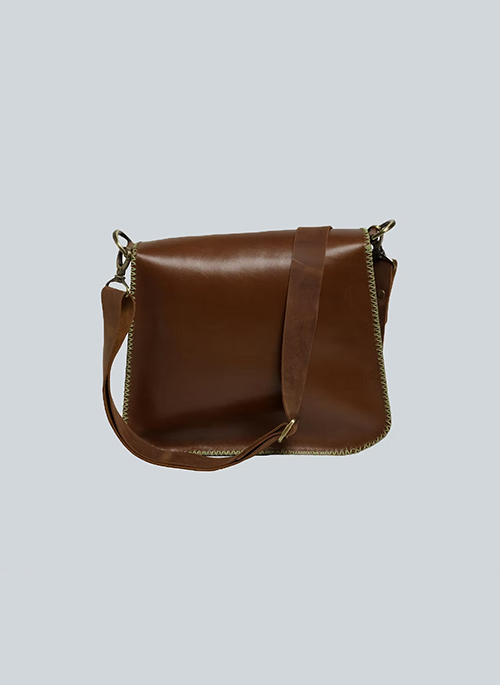 - Hand-stitched aged dark brown bovine leather with matcha pufferfish-leather pocket accents.