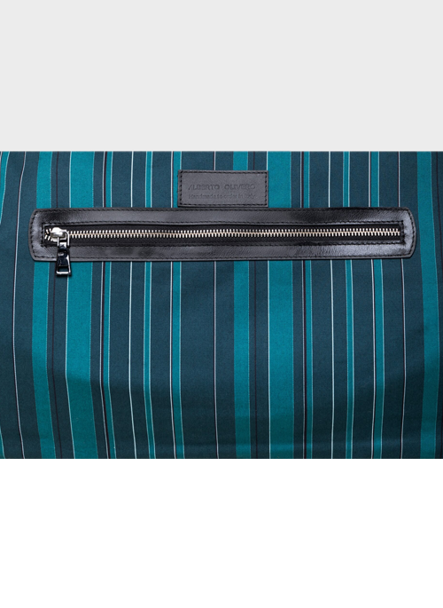 The accessory is embellished with the Alberto Olivero monogram logo in brass on the front, above the large diagonal zip pocket.
