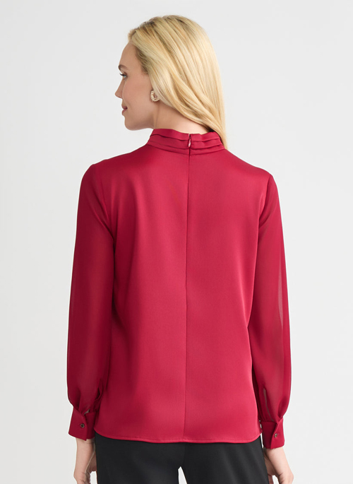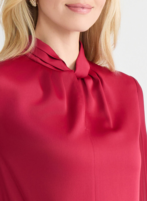 Crafted in fluid Crepe de Chine, this blouse defines understated luxury. A softly twisted neckline draws the eye with graceful detail, while sheer long sleeves add a note of delicacy. Side slits ensure comfort and ease of movement, making it a versatile choice for both polished evenings and elevated day occasions.