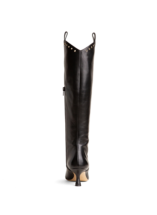 Stunning knee-high black leather boot crafted with grommet details, and inside zipper and a comfortable kitten heel. Timeless boho style!Details: