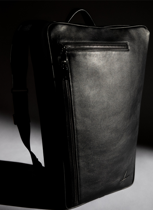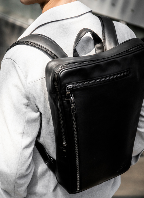 The exposed zippers follow the contours of the body, designed for an ergonomic shape that perfectly fits the wearer's back.