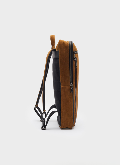 The exposed zippers follow the contours of the body, designed for an ergonomic shape that perfectly fits the wearer's back.