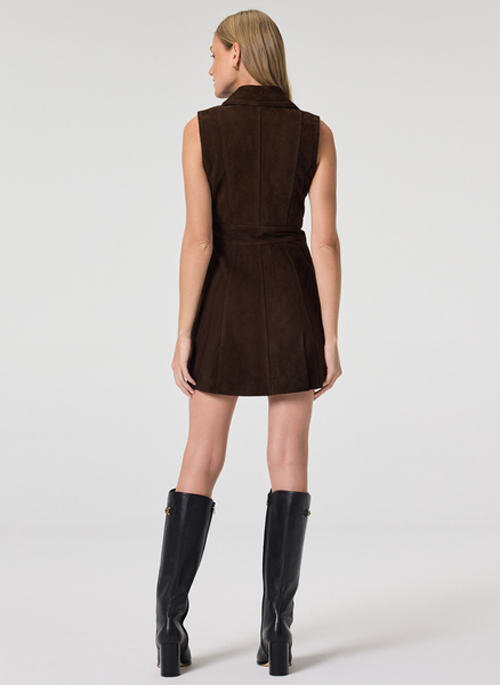 Crafted from buttery soft suede in chocolate brown, this sleeveless a-line mini dress features a v-neckline, lapel collar, welt pockets, and dark brown buttons. Pair the Vida Dress with the matching Feyd Jacket for an effortlessly chic matching set moment.