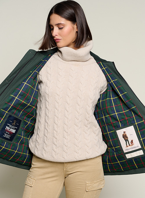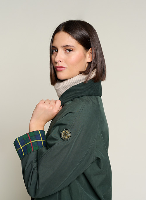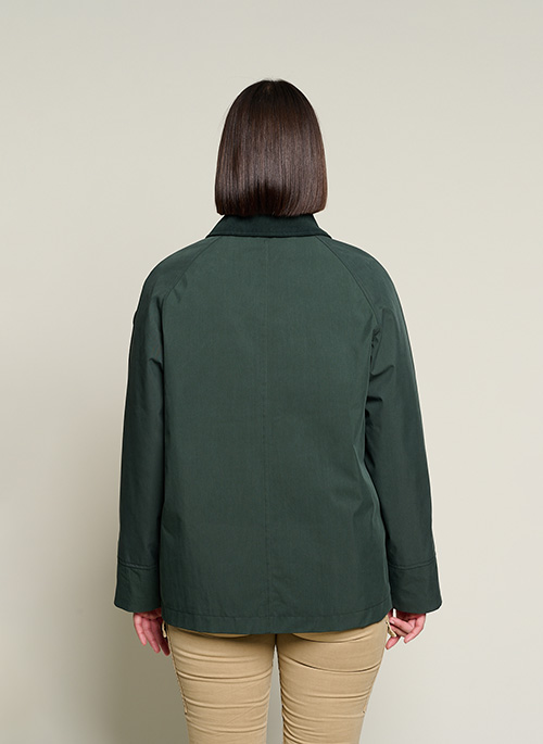 Women's short parka with a corduroy collar. Center closure with a custom double-slider zipper and personalized buttons. Welt pockets. Printed lining. Water-repellent and windproof fabric.Details: