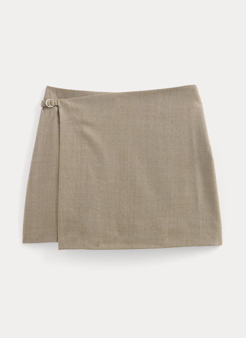 This mini wrap skort has built-in interior shorts for coverage and fastens with a double d-ring at the side for easy adjustability. Made with a RWS-certified wool blend with a touch of stretch for comfort, its fabric gives a nod to classic menswear suiting. Throw it on with knee-high boots and top with a matching blazer for your own take on power dressing.Details: