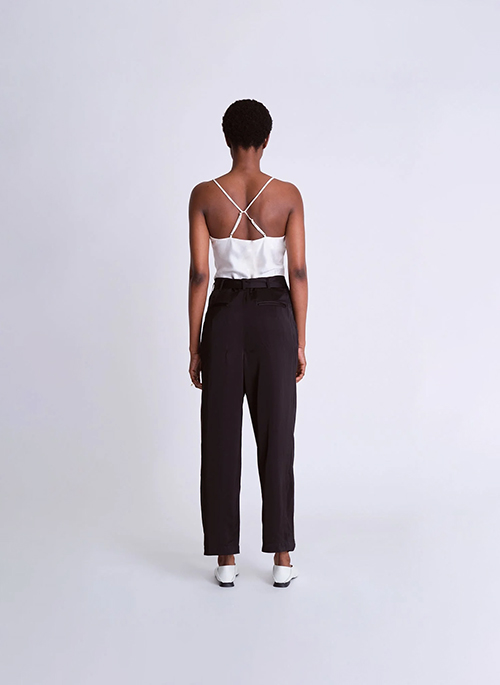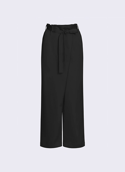 The Neza ankle length wrap trousers are a relaxed and easily adjustable fit. Made in sustainable cotton viscose blended satin, the trousers have slanted front pockets and back welt pockets. A fixed self-fabric belt wraps around the waist and fastens at the front. Black color.Details: