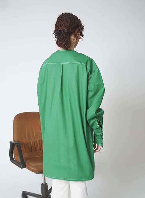 - Button placket highlighted by white topstitching.