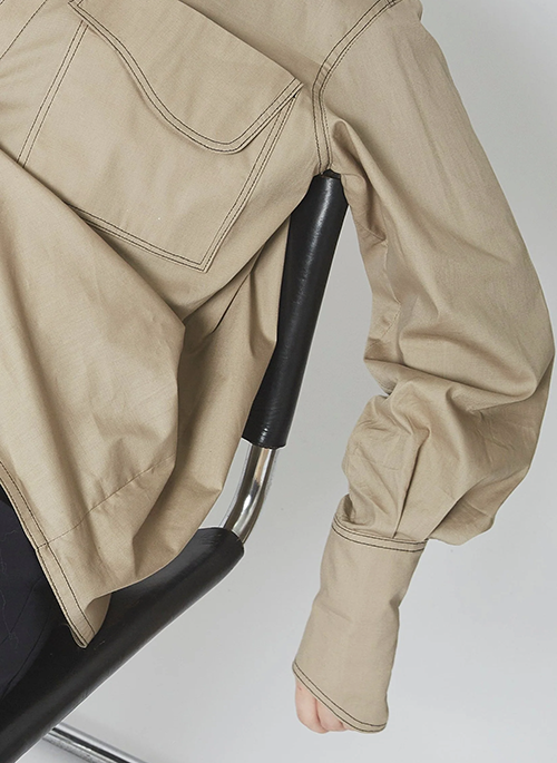 Details: Soft and structured beige cotton. Straight cut, slightly fitted. Contrasting topstitching that highlights the graphic design.Zigzag cutouts on the front create a dynamic effect.Collarless