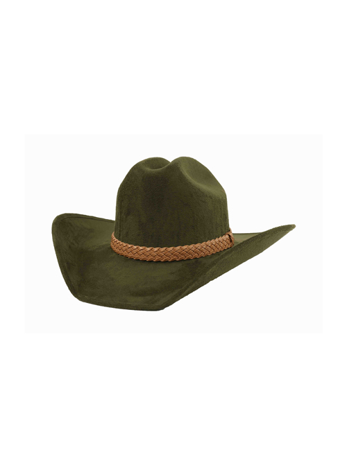 The Apple suede western hat blends classic craftsmanship with contemporary allure. The structured crown and sleek brim are elevated by a polished tan braid that wraps the base, creating a perfect balance of western heritage and high-fashion artistry.