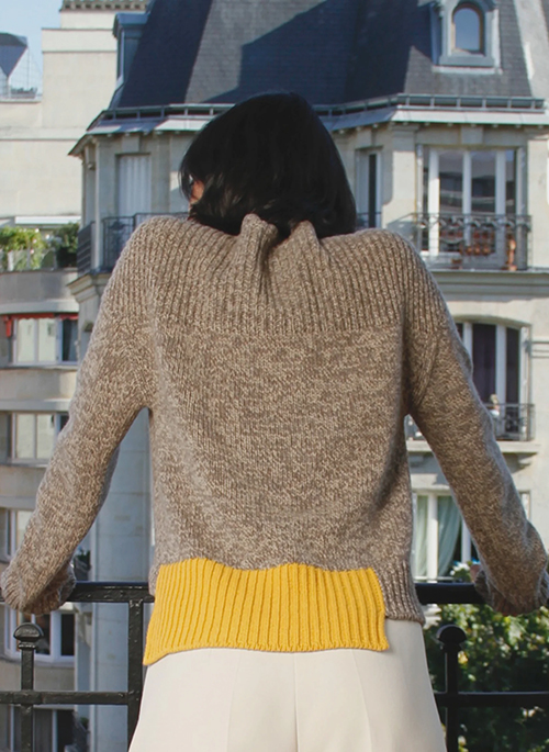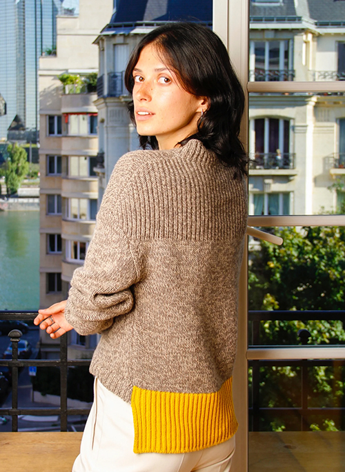 Chunky sweater made in Italy with an asymmetric and bi-color hem. An iconic piece for an absolute warmth and comfort. This knitted sweater is made from regenerated cashmere: a circular and sustainable process made in Italy.Details: