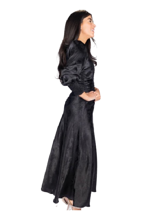 THIS ELEGANT CLASSIC BLACK MIDI DRESS IS A TIMELESS STATEMENT PIECE, PERFECT FOR BOTH FORMAL OCCASIONS AND EVENING GATHERINGS. DESIGNED WITH A LUXURIOUS JACQUARD FABRIC, IT FEATURES A DELICATE TONAL PATTERN THAT ADDS DEPTH AND SOPHISTICATION. THE DRESS SHOWCASES A FLATTERING RUCHED BODICE THAT ENHANCES THE SILHOUETTE, WHILE THE PUFFED LONG SLEEVES WITH FITTED CUFFS BRING A TOUCH OF VINTAGE CHARM.