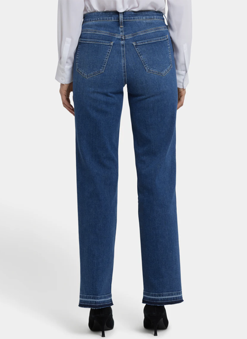 NYDJ's Bailey Relaxed Straight Jeans have a stylish laid-back look. A relaxed fit through the hips and thighs makes this straight-leg jean the perfect casual-chic option for your wardrobe. Our Lift Tuck® Technology uses a proprietary slimming panel with a patented criss-cross design to shape and support your curves for an always-sleek silhouette. Features five-pocket styling, a zip fly with button closure and released hems. Opera Blue is a classic medium indigo wash with vintage-inspired whiskering and hand sanding. This jean is made with earth-friendly methods that result in reduced consumption of water, chemicals and/or energy.