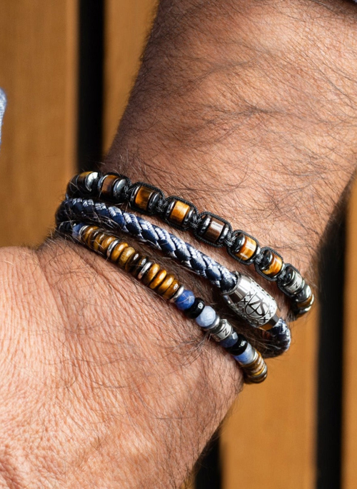 Tantalizing colors blend in perfect harmony on bracelet BANJO. Combining 6mm Lapis Lazuli beads with black Agate and twinkling Sodalite facet, plus impressive rows of Tiger Eye discs, it's beautiful beyond words. Stainless steel components adorn the design, including a quietly engraved ZEADES cylinder, and its soft, sandy shades radiate natural beauty. Easily adjustable with an elastic stretch band that fits most wrists (17 to 19 cm).