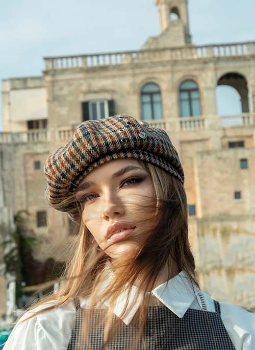 The beret beret is made of fine checked wool fabric, featuring warm autumn shades of brown, blue and bauxite red. The material comes from the renowned woolen mill Bottoli, a symbol of Italian excellence in wool processing.Details: