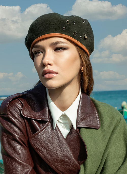 Our Turenne is a Sherwood green wool felt beret that combines elegance and sartorial tradition. The soft felt provides thermal comfort, while the brown leather trim lends a refined touch. Doria eyelets and pins in golden brass complete the design with exclusive details, a symbol of quality craftsmanship. Perfect for those seeking a classic yet distinctive style.Details: