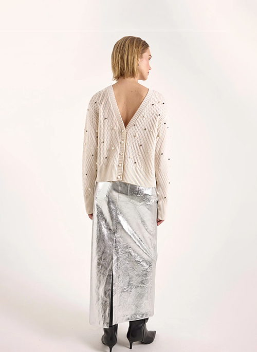 The Beverley Beaded Cashmere Cardigan is a beautifully versatile cashmere layer designed to be worn both ways, offering two refined looks in one. Crafted from 100% pure cashmere, it features delicate pearl beaded detailing and an intricate cable stitch that add texture and elegance. This reversible style gives you endless styling options, wear it buttoned at the front for a classic finish or reversed for a modern, elevated twist. Cut to a regular fit that sits at the waist, Beverley pairs effortlessly with tailored trousers, denim, or occasion wear for a polished yet luxurious look.Details: