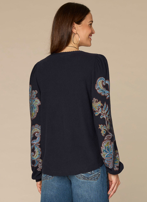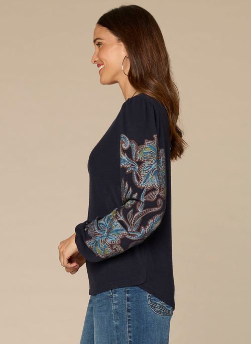 With long blouson sleeves, an embroidered scoop neck, and a floral placement print, this knit top is a basic—but it’s far from boring. Flattering, feminine, and full of style, it’s a year-round favorite.