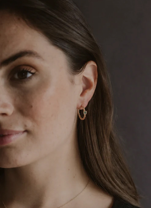 Everyday armour. Lichen-inspired gold vermeil hoops with vibrant green chalcedony for inner harmony and chart-your-own-path energy. It's not just jewellery.